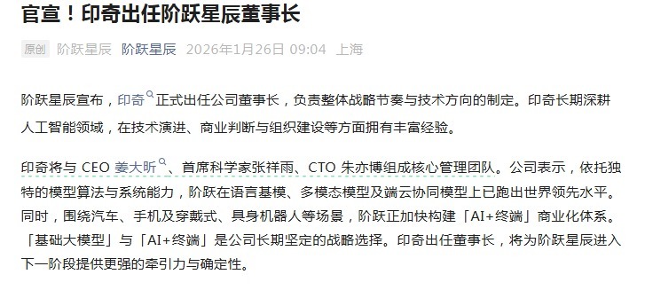 这也意味着,印奇这次出任阶跃星辰董事长,并非“秀雅性挂名”,而更接近于深度参与公司计谋与治理。