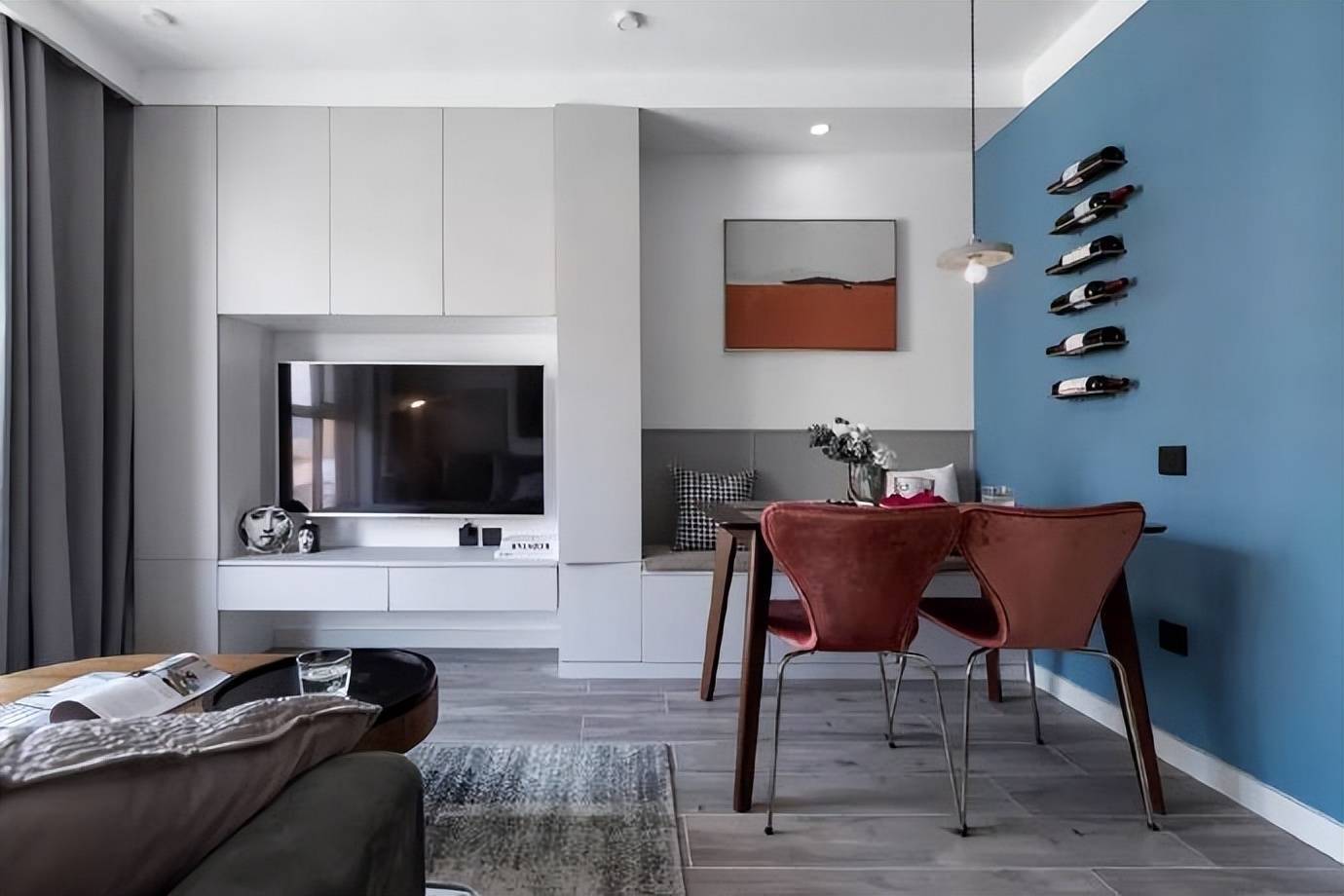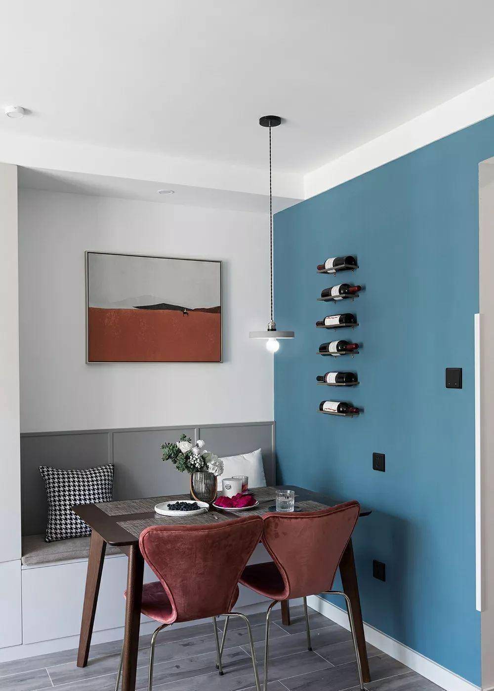 餐桌旁配景墙刷蓝色乳胶漆,蓝色与胡桃木、红色丝绒搭配造成独有色调碰撞,使空间更具脉络感与视觉冲击力。蓝色配景墙上装有置物架,很是用于舍弃红酒。置物架想象检朴,既能展示红酒又具遮挡作用,让餐厅更有立场。