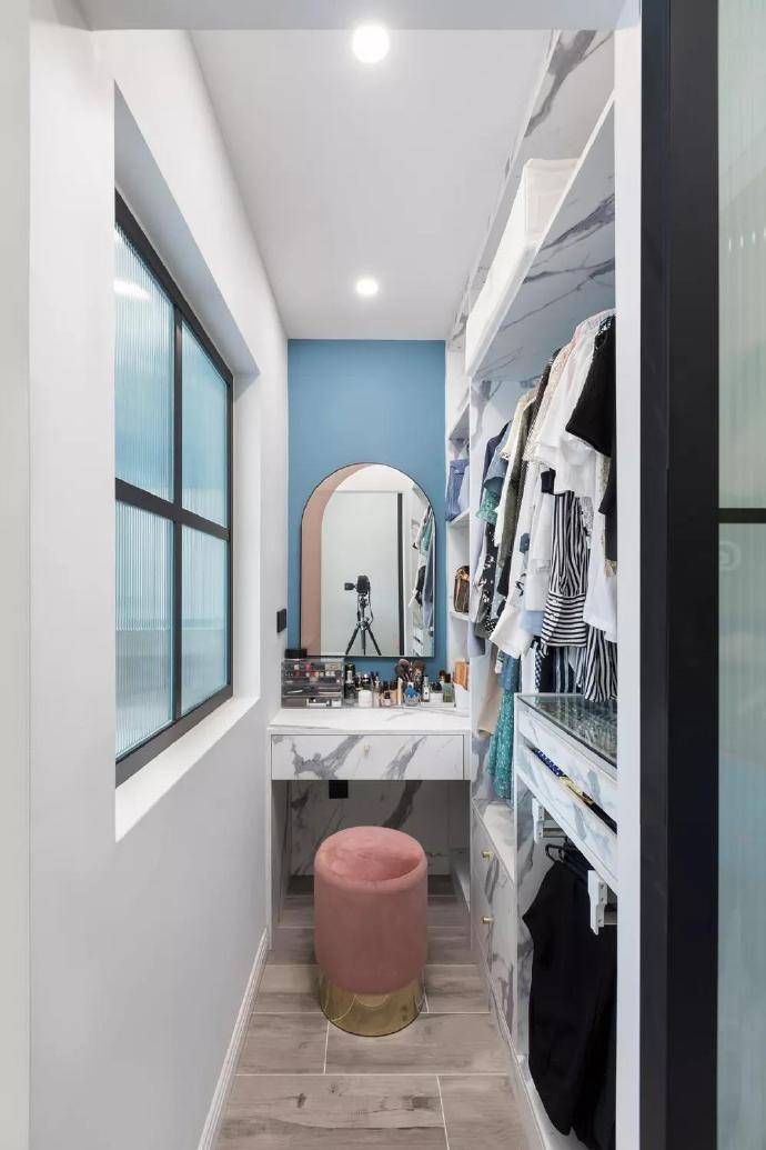 悉数衣帽间想象功能王人全,兼顾好意思不雅实用。谷仓玻璃移门隔绝使空间豁达通透,大理石纹理衣柜和梳妆台布局擢升房间举座档次。