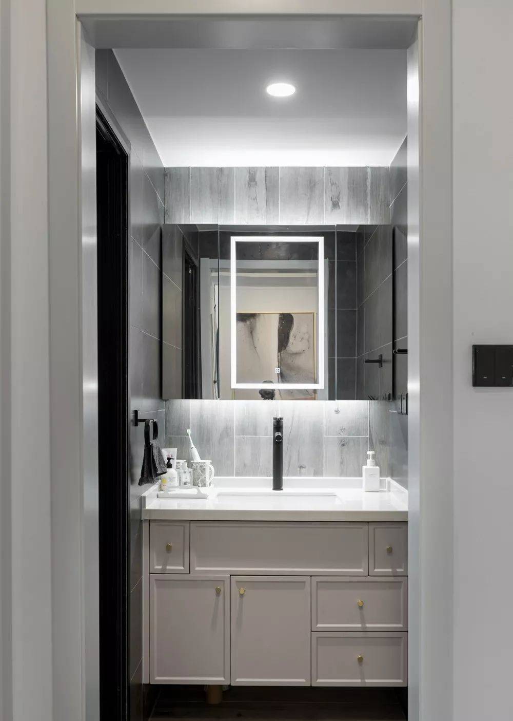 鞋柜想象贴心,中间与底部留有空位。中间方便摆放钥匙钱包等随身物品,下方可舍弃常穿鞋子,保捏大地整洁。左手边很是开导换鞋凳,方便相差换鞋,足下舍弃雨伞桶,让雨具有固定存放处而不占其他空间。此外,玄关处安装全身镜,既方便外出整理姿首,又在视觉上扩大空间感。这个全心交代的区域充分辩论家庭成员闲居需求,擢升活命便利性与欢然感,每个细节想象都体现对活命品性的追求与对家东说念主的顺心,让家在功能与好意思不雅间找到最好均衡。