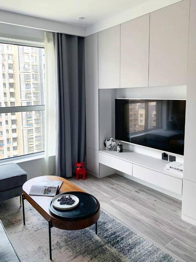 大地铺设木纹砖,兼具木地板的当然质感与瓷砖的耐磨、易清洁特质,举座嗅觉和煦而高尚。电视墙与餐厅的卡座想象互连结气儿,造成长入连贯的视觉后果,巧妙会通了两个空间。电视墙全心定制成柜子造型,兼具遮挡性与实用性。柜子高下部分设有多个储物空间,可存放各样家庭用品与遮挡品,电视镶嵌中央,周围预留灵通式展示架,用于摆放竹素、相框与艺术品,使电视墙成为家居一大亮点。
