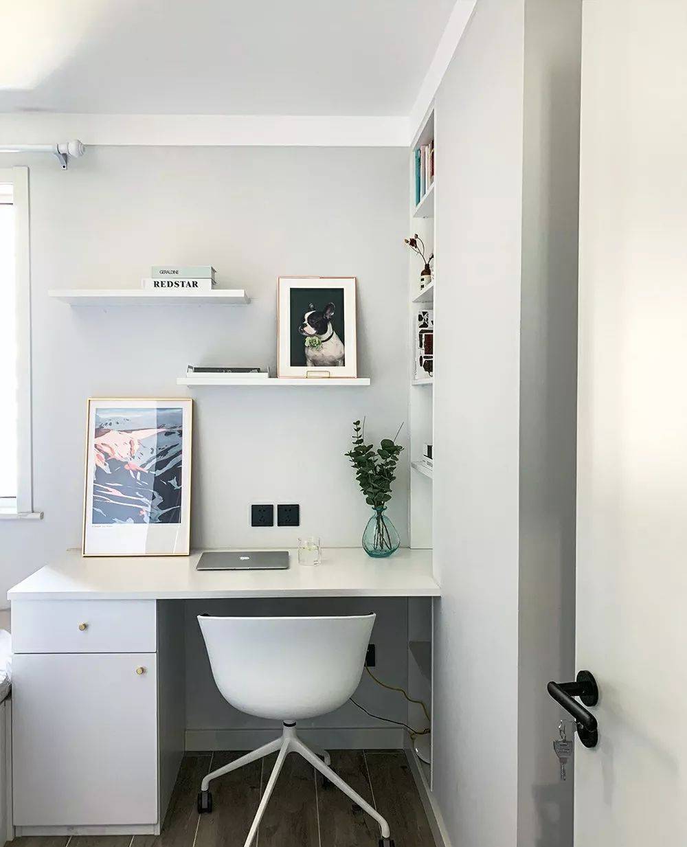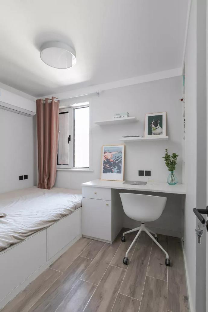 椅子相宜东说念主体工学想象,提供细密撑捏,确保万古辰责任学习欢然。墙面和侧墙加安装物隔板,为次卧提供更多储物与展示空间。置物隔板可摆放竹素、遮挡品、植物等,增多实用性与视觉脉络。通过合理交代,隔板擢升房间收纳智商又增添个性温馨,次卧想象戒备功能性与好意思不雅性王人集。