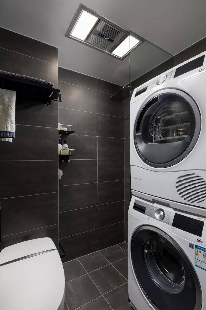 玻璃门通透不挡视野,使卫生间更开阔亮堂,有用防患水花四溅,保捏外部干燥。淋浴区内花洒与淋浴喷头配备王人全,沉迷体验欢然欢然。洗衣机和烘干机巧妙叠放,检朴广阔空间,提高空间运用率,方便闲居洗衣烘干责任。洗衣机和烘干机上方可安装袖珍储物架,舍弃洗衣液、妩媚剂等用品,增多使用方便性。