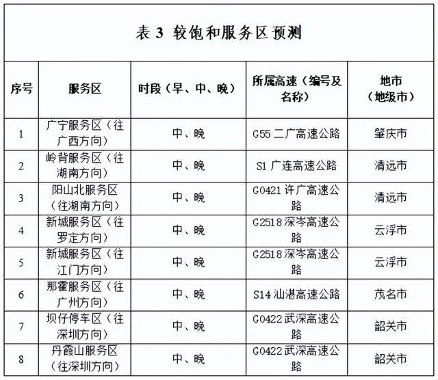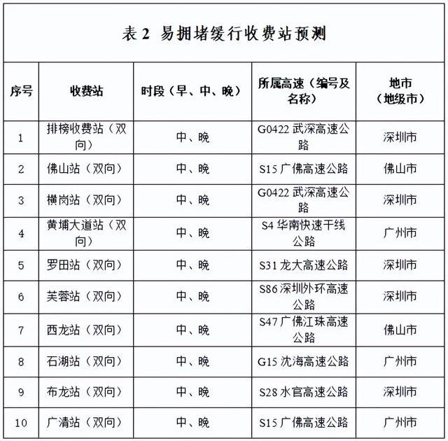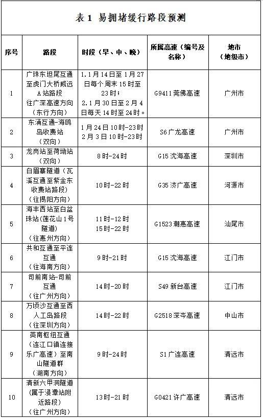 另据广东省交通运输部门此前预测,G0421许广高速广骄横速段、G35济广高速公路河源段、G75兰海高速公路湛江段、G9411莞佛高速虎门大桥段、S41广州机场高速等部分点段易缓行。