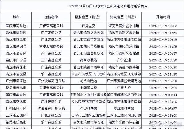 据广东交警先容,1月19日16时全省高速通行幽静长度跨越5公里,时候跨越30分钟的点段共16个,区别在韶关市、云浮市、清远市、肇庆市、广州市。